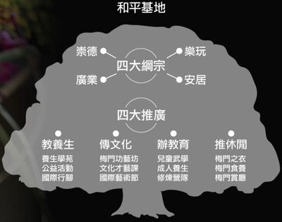 幾十年來,陸續成立「梅門總部」;「梅門平甩堂」全球健康服務中心;「梅門思塾」古今六藝教育中心; 「梅門功藝坊」文創表演團;「梅門餐飲聯盟」素養餐廳;「梅門甩茶」文化茶館;「梅門需要房」養生超市;「梅門德藝文創」調氣和百工百藝之應用與傳承;「梅門大義山莊」山中修行道場;以及「梅門文化基金會」舉辦各項養生藝文和國際交流活動,推動終生學習和修煉。